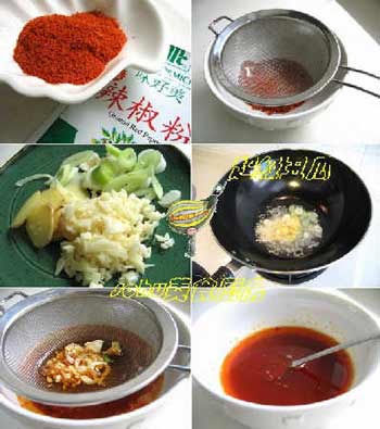 ??? 蔥姜蒜洗凈,切碎。起鍋,倒入油,待6成熱時,放入蔥姜蒜碎,爆炒出香味,關火,沖入辣椒粉中,沉淀候瀝出的油就是紅油了。(備注:如果沒有過濾網,將蔥姜蒜撈出后,再將油沖入辣椒粉中。)