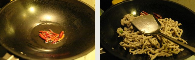 火燒熱,放入干紅辣椒炒香后,放入洗干凈的面筋絲,大火翻炒,加入鹽和生抽調味。