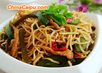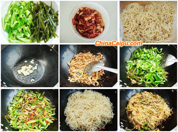 4、放海帶絲翻炒一會,再放青紅椒絲,翻炒一下。