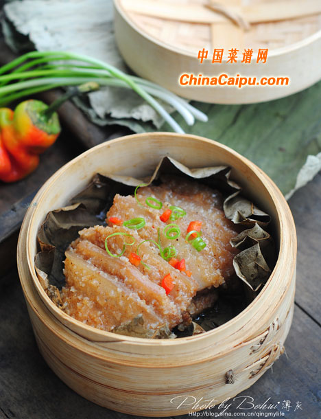 6、蒸籠里鋪上荷葉,將肉擺放上去,或者直接擺放在盤中。