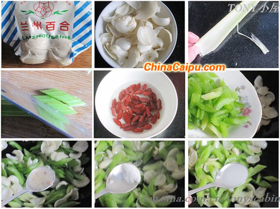 5.熱鍋冷油倒入西芹和百合翻炒幾下;