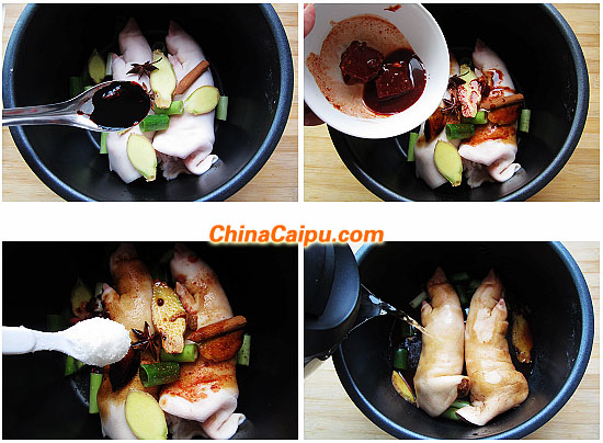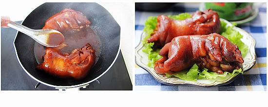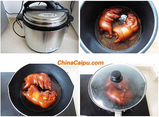 4、高壓鍋加蓋開火燉煮1小時(shí)候,將燉好的豬蹄和湯汁一起放入炒鍋中,繼續(xù)燉煮15分鐘,并不斷將湯汁淋在豬蹄上,最后湯汁收緊即可出鍋