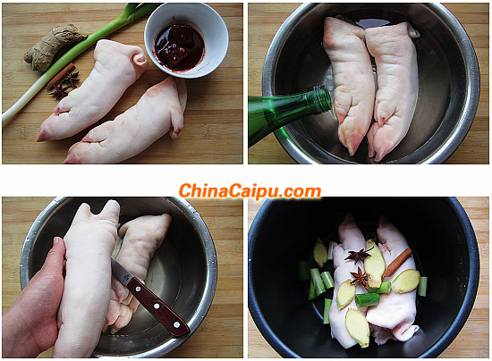 原料:豬蹄2只、腐乳1塊、蔥姜、八角2個(gè)、桂皮1塊、白醋1大勺、白酒2小勺、白糖2小勺、