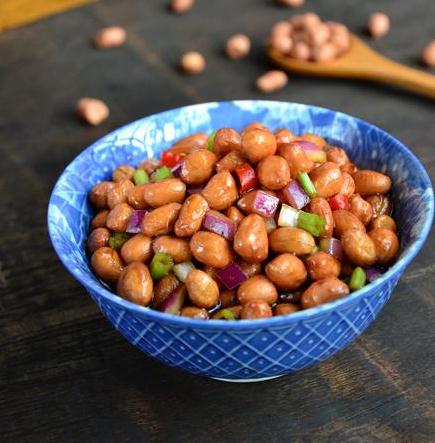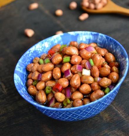 ⑥待花生米徹底冷卻后,放入芹菜、洋蔥粒,再倒入味汁拌勻,泡制半小時即成。