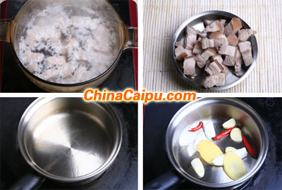 3、鍋內(nèi)做水放入切好塊的五花肉