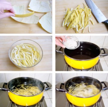 2、將柚子表皮切下,將柚子皮和柚子肉中間的白色部分去掉,切成細絲,放入淡鹽水中浸泡15分鐘