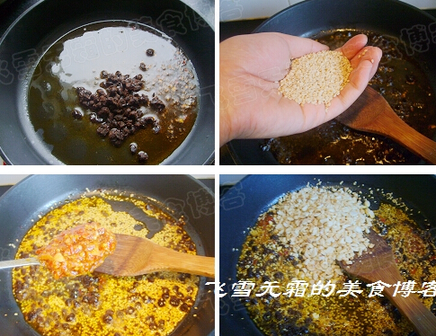 5,鍋中放蒜蓉香辣油,倒入豆豉先爆香