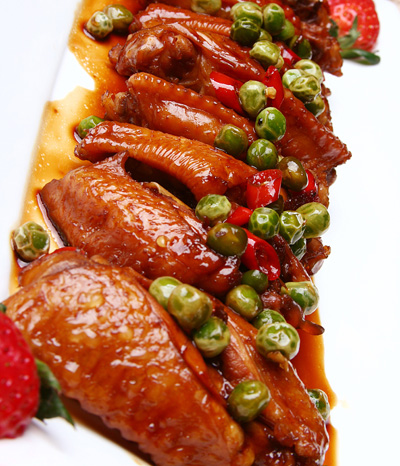 4、 鍋內(nèi)留底油,放入蔥、姜、辣椒,煸香放入炸好的雞翅加陳皮、冰糖、開水燉5分鐘,加青豆、枸杞再燉1分鐘即可出鍋擺盤。