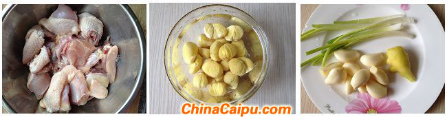 1、新鮮土雞洗凈斬大塊,板栗去殼去皮用清水浸泡,姜大塊、蒜整粒拍破,蔥白整段。