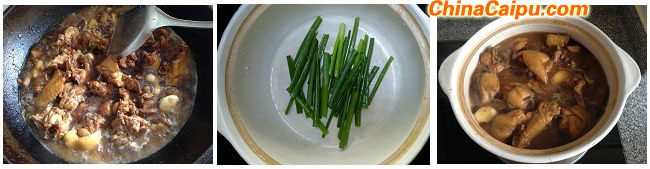 煲,將蔥葉墊底,倒入燒開的雞塊和湯。