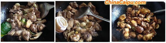 3、將雞塊炒勻,烹入適量料酒,加生抽、老抽炒勻上色。