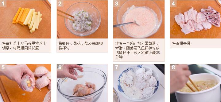 芝士釀雞翼配飛魚籽汁的材料:雞中翅8個(gè),蝦膠100g,車打芝士50g,馬蘇里拉芝士50g,蔥花2湯匙,鹽,白胡椒粉,生粉