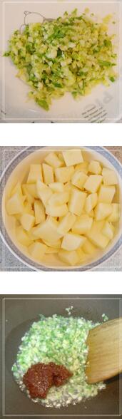 3.坐鍋倒油燒熱先放入蔥姜蒜末,稍炒一下再放入辣醬翻炒香后,再放入土豆,一些料酒、生抽和胡椒粉翻炒均勻即可,這個(gè)時(shí)候土豆還是生的。