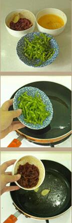 3、坐鍋倒油燒三成熱時(shí),放入青椒大火迅速翻炒變色后盛起備用;