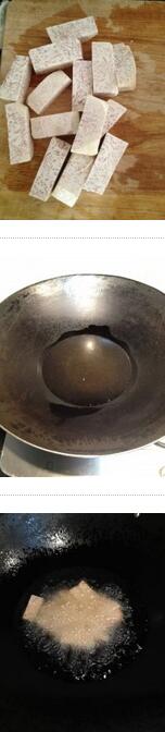 2. 坐鍋倒油燒到七成熱,香芋放入油鍋里炸。炸到表面微黃,撈起濾油。