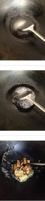3. 鍋?zhàn)酉磧?,白糖和水放入鍋里,用小火熬制,開(kāi)始冒大泡,再煮一會(huì)兒,會(huì)變成小泡,水份也減少了,這時(shí)倒入炸好的香芋,關(guān)火,然后快速翻炒,炒至芋頭表面的糖都凝固即可。