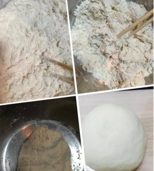 1.將燒開的滾水倒入面粉中,邊倒邊用筷子不停的攪拌,成松散的面絮即可