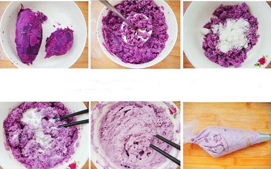 1、紫薯兩個(gè)約200g,蒸熟去皮,放一大碗中用壓土豆泥的工具碾成泥,加入20g細(xì)砂糖,50g奶油,用電動打蛋器以低速攪打至順滑;