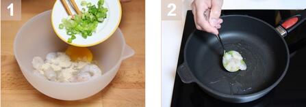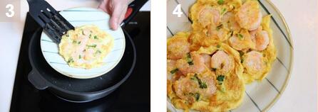 2.高火再油鍋中加熱適量,放入一勺蝦和雞蛋的混合物,煎至餅成型。重復(fù)此動作直到所有材料用完,即成。