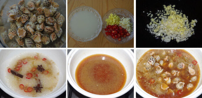 辣酒煮花螺的材料:花螺500g、姜、蒜、鮮紅椒、蔥、八角、桂皮、魚露、鹽、生抽、胡椒粉、生抽、甜酒汁、白酒、陳醋