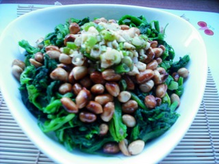 9 上桌前倒入調(diào)好的料汁,一盤香辣、甜、酸適口的菠菜拌花生米一會(huì)功夫就落入我們一家三口的腹中。