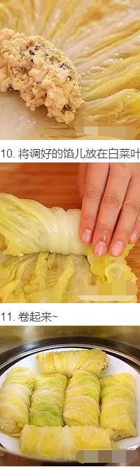 6. 將調好的餡兒放在白菜葉上,卷起來碼在盤中