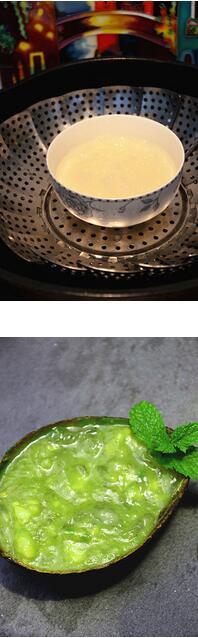 4.把蒸好的燕窩跟壓成碎塊的牛油果泥均勻攪拌在一起,重新填入牛油果殼中,點綴上薄荷葉即可享用了。