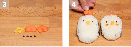 4. 將步驟3準(zhǔn)備好的食材裝飾在步驟2準(zhǔn)備好的飯團(tuán)上,做成小雞的樣子和其他裝飾。番茄醬用來做成小雞的紅色臉頰。