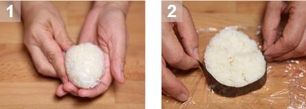 1. 將米飯放在保鮮紙上,用雙手做成一個(gè)橢圓形的球。