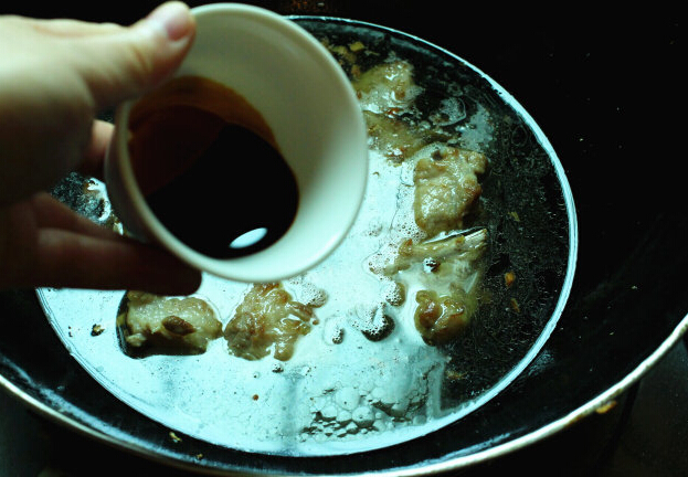 9、待肋排炒至兩面金黃,倒入適量清水,以剛好沒(méi)過(guò)排骨為宜