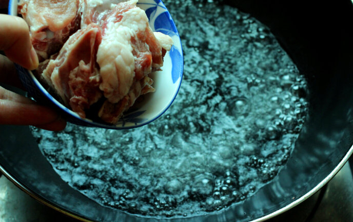 3、鍋內(nèi)置適量清水,待水沸以后,倒入肋排,焯一小會(huì)兒至變色