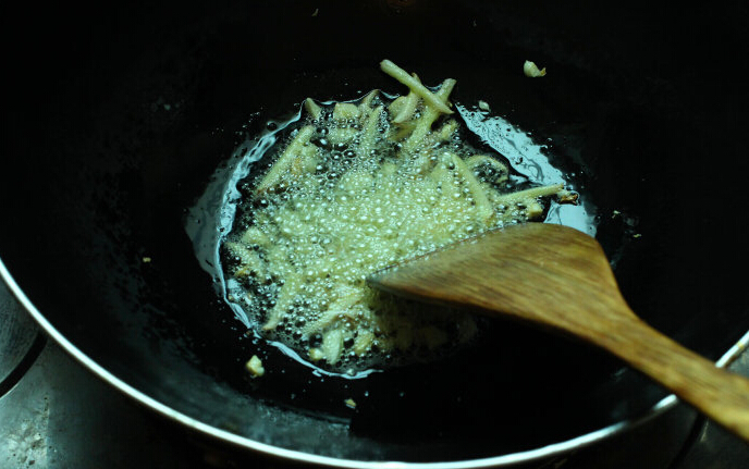 5、油溫?zé)嵋院?,倒入姜絲,蒜末爆香 美食網(wǎng)