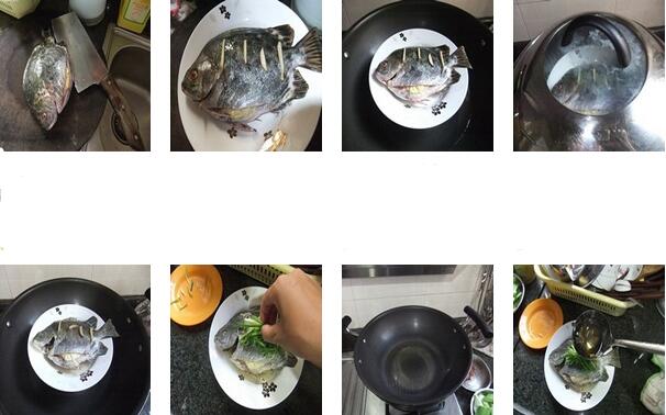 1.把金鼓魚刮去魚鱗去內(nèi)臟、魚腮洗凈,生姜切絲,蔥切絲