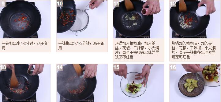 1.新鮮黃瓜去皮,并根據(jù)黃瓜大小切成2-3cm的小段,干辣椒洗凈切段,姜切絲;