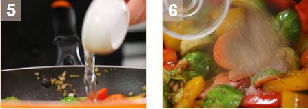 3.坐鍋高火燒熱鍋,加少許油,炒香蒜蓉及姜蓉,加入胡蘿卜、紅燈籠椒、黃燈籠椒炒勻后下入小甘藍(lán)炒勻,加入白酒、意大利黑醋、蜂蜜炒至均勻最后加入鹽及黑胡椒調(diào)味就完成了家常菜