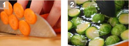 2.做過(guò)到水燒開(kāi),加入小甘藍(lán)汆燙2分鐘,撈起瀝干。