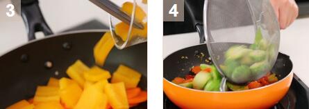 1.小甘藍(lán)切半;胡蘿卜切片;紅、黃燈籠椒去籽切片;蒜切蓉,姜去皮切蓉。