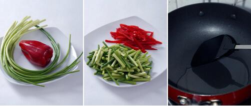2.蒜苔洗凈去掉蒂,切成3厘米長的段,紅椒洗凈去蒂去種切絲。