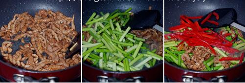 3.坐鍋倒油燒熱,放蔥姜熗鍋出香味后放入腌制好的牛肉,大火迅速翻炒至變色。加入蒜苔翻炒均勻。加紅椒絲,調(diào)入少許鹽,翻炒均勻就可以出鍋了。