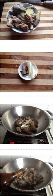1.把鵝肉在涼水中煮開后去除浮沫撈出,準備蔥姜、八角、桂皮
