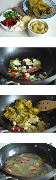 4、坐鍋燒熱倒油,放入蔥姜蒜、八角桂皮、花椒、干辣椒爆香后下酸菜和泡椒,小火煸炒出香味,再加入高湯燒開,將魚骨魚尾放入燉10分鐘左右,再將魚片放入燙熟,加雞精和鹽調(diào)味;