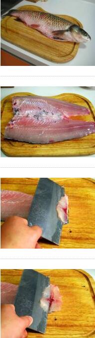 1. 草魚去鱗及內(nèi)臟洗凈,用刀切出魚身上的肉,先斜著切一刀,不要切到底,第二刀再斜著切到底,這就片好了夾刀片魚片了。學(xué)做菜