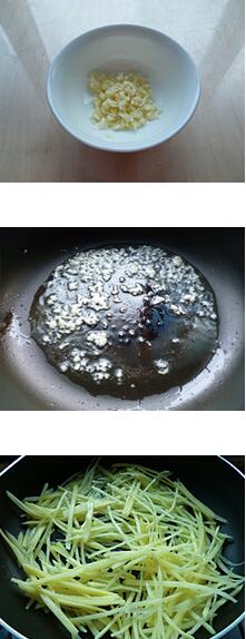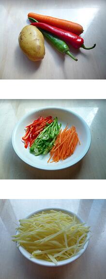 1.青紅椒切絲,胡蘿卜切絲,土豆切絲,用水沖洗掉表面的淀粉,瀝干水分,蒜頭切沫