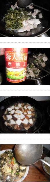2.干鍋下入豬肉煎豬肉倒微變色后放蔥姜,炒香后放雪里紅加少許醬油再放豆腐,加水燒煮