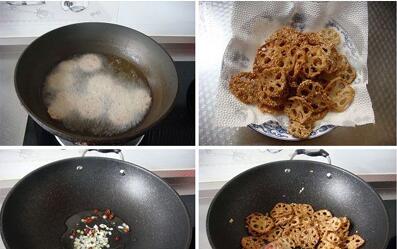 4、坐鍋留少許油,大火燒熱后放入蔥花和小辣椒椒圈一起爆香,最后放入炸好的藕片快速翻炒均勻即可。