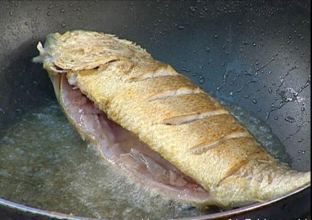 2 坐鍋放底油,將腌制好的黃魚下入鍋中進(jìn)行煎制,一面煎至金黃后翻到另一面,兩面煎至金黃后將鍋中的油倒出去