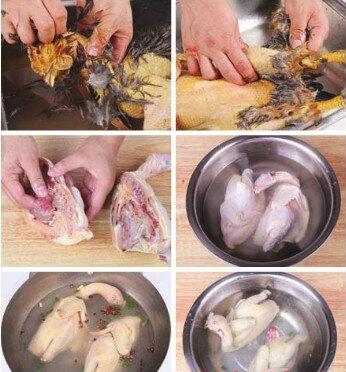 1.將仔雞宰殺,放入容器內(nèi),倒入適星的熱水浸泡,再褪去雞毛后再去掉仔雞的食管、氣管和內(nèi)臟,放入淡鹽水中浸泡并沖洗干凈,再放入沸水鍋內(nèi)汆燙出水, 撈出仔雞,用冷水過涼。