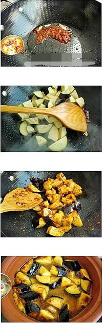 3.鍋留底油放入一勺黃豆醬炒香,倒入土豆和茄子翻炒至茄子有些變軟,倒入沙鍋中,加入清水,一點(diǎn)老抽,糖,大火煮開(kāi)中火燉煮10分鐘后把豆角和洋蔥放入,繼續(xù)大火煮直到豆角變軟。