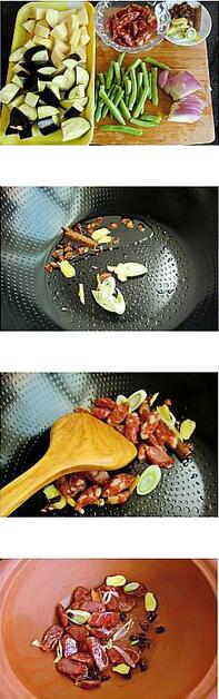 2.坐鍋倒油爆香蔥姜,大料,桂皮后倒入臘腸炒至透明,盛出放入砂鍋中。