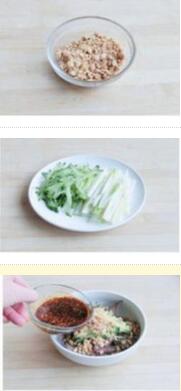 4.把料汁、五香花生打碎、黃瓜絲、蔥絲到入碗中調勻即可